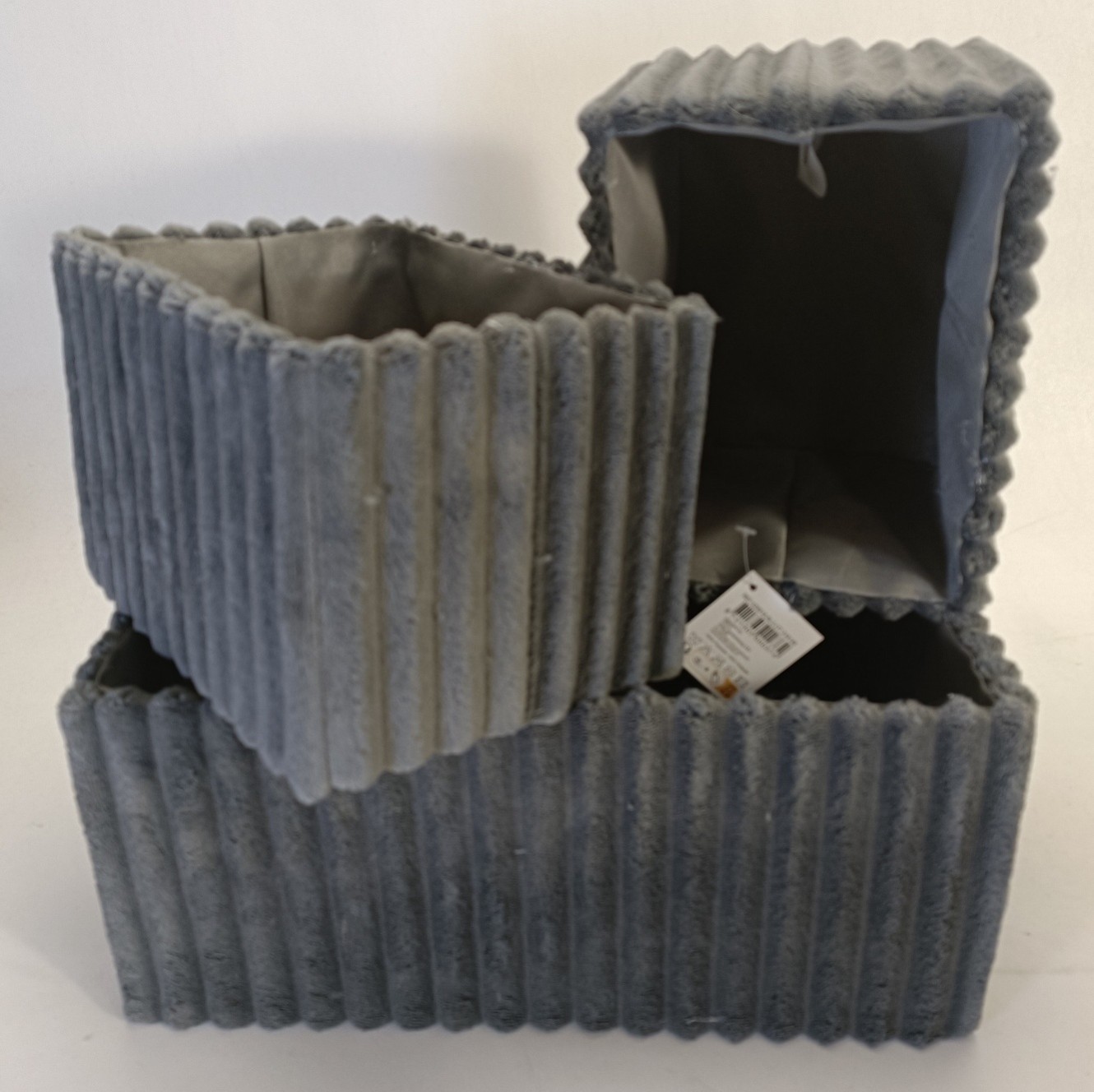 Kolmen harmaan ribatun korin setti. Korien koot 33 x 23 x 16 cm ja 20 x 15 x 14 cm (2 kpl)